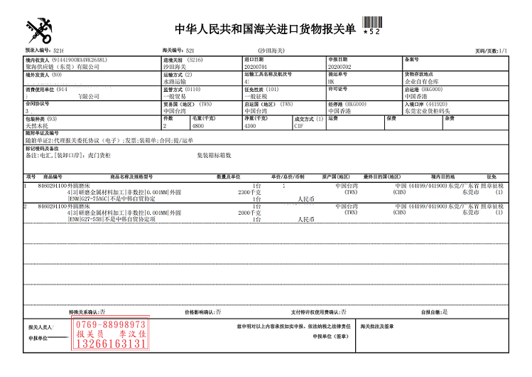 庆幸公司同事机缘巧合刚刚两台台湾产外圆磨床,因为收货单位为东莞清溪一台资企业,所以清关口岸选择的是东莞虎门宏业码头,该企业刚刚注册成立,人手也不够,且对虎门港进口清关手续也不是特别了解,一来二去多次沟通后,最终确认台湾工厂交货即EX-WORK的成交方式,由小编公司全程操作整套物流及清关.这不刚刚拿到进口报关单,小编就迫不及待的把整个操作流程整理出来,希望能带给更多小伙伴技术指导.